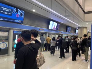 韓国はキャリア航空会社(アシアナ、大韓)は入国審査終えてすぐに搭乗口がありますが、LCCは地下鉄に乗らないとたどり着けない遠くに搭乗口があります